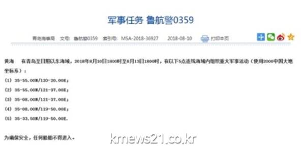 중국 해사국은 "해당 지역에서 중대한 군사 활동을 이뤄질 예정이므로 안전을 위해 어떠한 선박의 진입도 금지된다"고 밝혔다.