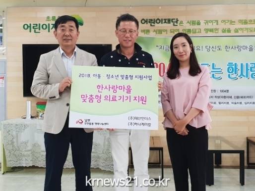 지원 사업은 광주지역 기업체인 ㈜태산인더스(대표 이낙준), ㈜하나케미칼(대표 정호섭)에서 후원한 기금을 통해 한사랑 마을에 입소해 치료 중인 아동들을 위한 산소포화도 측정기 3대(330만원 상당)를 지원했다.
