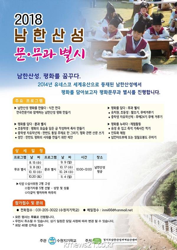 ‘남한산성 문무과 별시’는 조선후기 국왕의 남한산성 행차 시 치러졌던 과거시험을 오늘날 상황에 맞게 재조명해 의미를 되새기고자 마련됐다. 11월까지 문과시험 4회(9.9/ 10.17/ 10.24/ 11.4), 무과시험 4회(8.15/ 9.8/ 10.10/ 10.20)가 각각 진행된다.