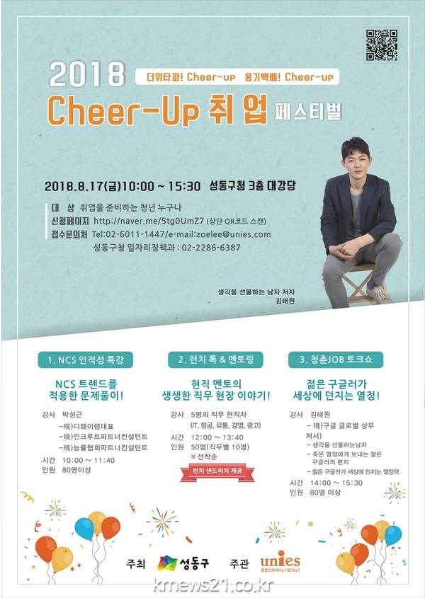 ▲ (사진=성동구)성동구 (구청장 정원오)는 오는 8월 17일 오전 10시부터 오후 3시30분까지 성동구청 3층 대강당에서 취업을 준비하는 청년들을 대상으로 취업역량강화와 사기진작을 위한 축제 ‘2018 Cheer up 취업 페스티벌’을 개최한다.