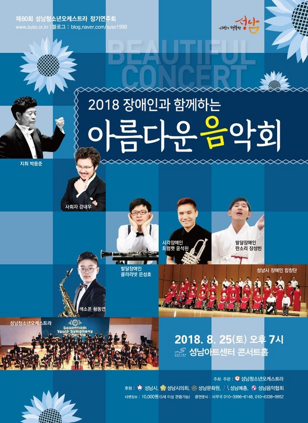 성남청소년오케스트라(감독 겸 상임지휘자 박용준) 주최, 성남시, 성남시의회, 성남문화원, 성남예총, 성남음악협회가 후원하는 ‘2018 장애인과 함께하는 아름다운음악회’가 8. 25(토) 오후7시 성남아트센터 콘서트홀에서 열린다.