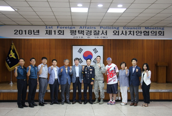 평택경찰서(서장 김태수), 2018. 8. 16.(목). 10:30∼11:30, 평택경찰서 3층 대강당에서는 미군기지 주변 등 평택시 외국인 밀집지역의 안정적인 치안확보를 위해 ‘2018년 제1회 외사치안협의회 발대식 및 정기회의’를 개최하였다.