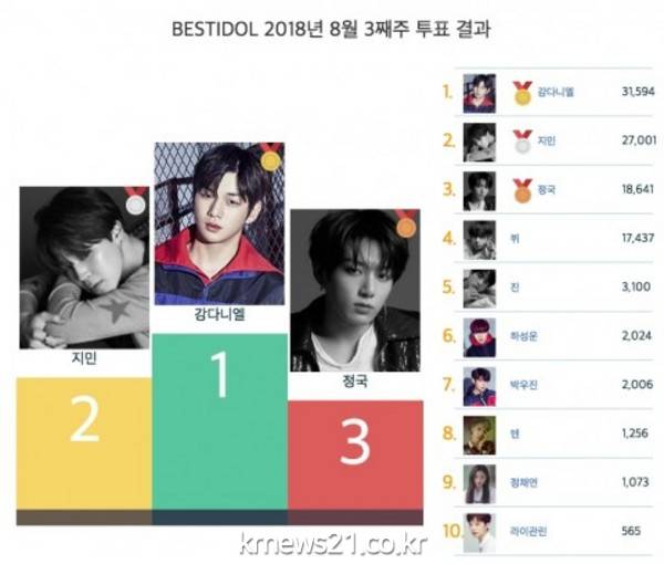 8월 3주 TOP 10은 1위 강다니엘, 2위 지민(방탄소년단), 3위 정국(방탄소년단), 4위 뷔(방탄소년단), 5위 진(방탄소년단), 6위 하성운(워너원), 7위 박우진(워너원), 8위 텐(NCT), 9위 정채연(다이아), 10위 라이관린(워너원) 순이다.