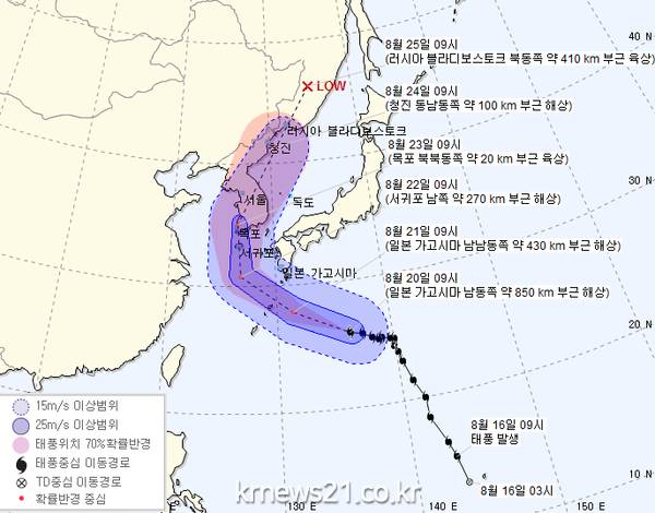 이어 23일 우리나라를 관통해 24일 오전 9시쯤에는 함경북도 청진 동남동쪽 100㎞ 부근 해상까지 진출할 것으로 전망했다.