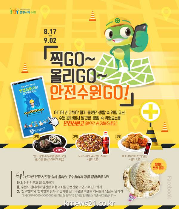 수원시 관내에서 발견한 생활 속 위험요소를 ‘안전신문고’ 앱으로 신고하고, 신고 내용을 수원시 공식 SNS에 인증한 사람에게 선물을 주는 ‘안전한 수원 SNS 이벤트’가 9월 2일까지 진행된다.