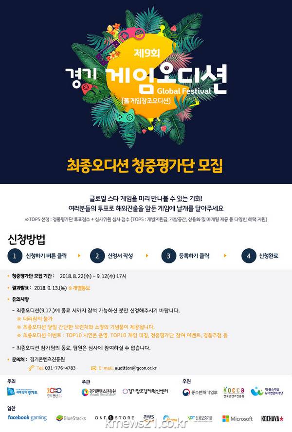 경기도는 국내 게임기업의 세계시장 진출을 위한 제9회 경기게임오디션(舊 게임 창조오디션)-글로벌 부문(이하 ‘오디션’) 최종 우승팀 선발에 참여할 청중평가단을 22일부터 9월 12일까지 모집한다.