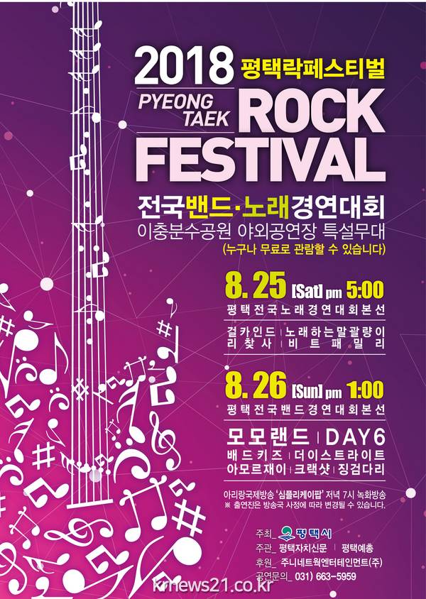 본선진출 밴드 및 보컬은 25일~26일 평택시 이충분수공원 야외공연장에서 본선 경연을 펼치며, 26일 오후 7시에 진행되는 축하공연에는 모모랜드, DAY6, 배드키즈, 더이스트라이트, 재이, 크랙샷, 걸카인드, 노래하는 말괄량이 등 인기연예인이 출연해 멋진 무대를 선사할 예정이다.