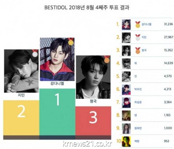 8월 4주 TOP 10은 1위 강다니엘, 2위 지민(방탄소년단), 3위 정국(방탄소년단), 4위 뷔(방탄소년단), 5위 진(방탄소년단), 6위 박우진(워너원), 7위 하성운(워너원), 8위 텐(NCT), 9위 정채연(다이아), 10위 백현(EXO) 순이다.