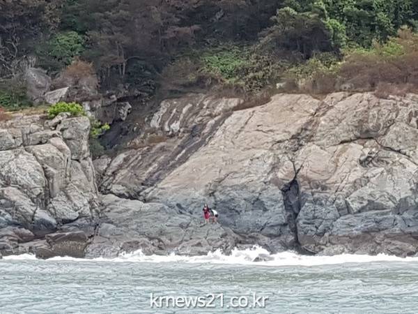 너울성 파도에 밀려 갯바위에 고립된 김 모(40세, 남) 씨와 이 모(45세, 여) 씨를 해경구조대가