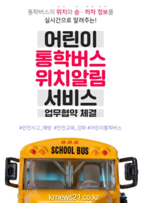 어린이통학버스 위치알림 서비스는 어린이의 통학버스 승하차 여부를 학부모에게 문자로 알려 주고, 통학버스 위치정보를 학부모가 실시간으로 조회할 수 있게 해준다.