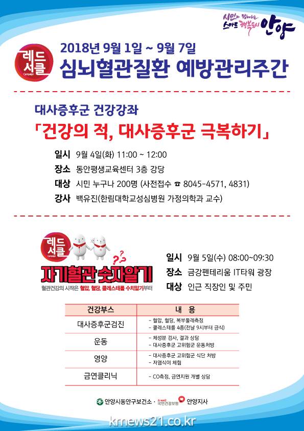 안양시(시장 최대호)는 심뇌혈관질환 예방주간을 맞아‘건강의 적, 대사증후군 극복하기’강좌와 ‘자기혈관 숫자알기, 레드서클’캠페인을 개최한다.