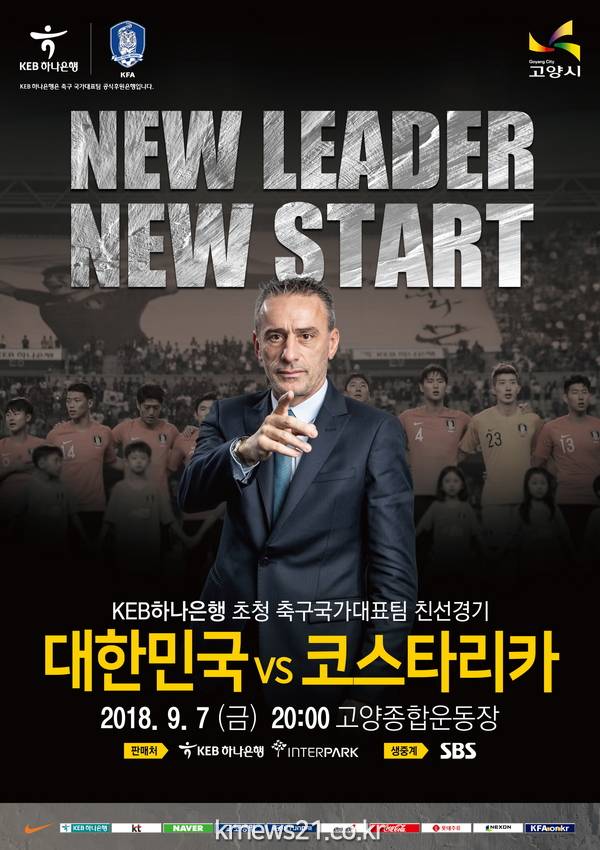 고양시(시장 이재준)는 오는 9월 7일 저녁 8시 축구대표팀 파울루 벤투 감독(49)의 데뷔전인 코스타리카와의 친선경기를 고양종합운동장에서 연다고 밝혔다. SBS-TV 생중계.
