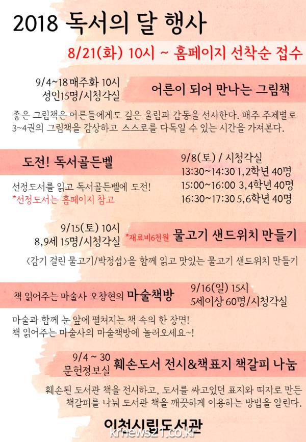본 행사는 9월 4일부터 어른이 되어 만나는 그림책 수업을 시작으로 도전! 독서골든벨, 물고기 샌드위치 만들기, 책 읽어주는 마술사 오창현의 마술책방 공연, 훼손도서 전시 및 책표지 책갈피 나눔이 9월 말까지 진행될 예정이다.