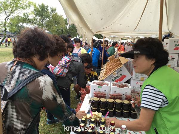 직거래장터에는 관내 100여 농가가 참여하여 사과, 쌀, 된장 등 우리지역 농산물과 농산물 가공품을 저렴하게 판매한다.