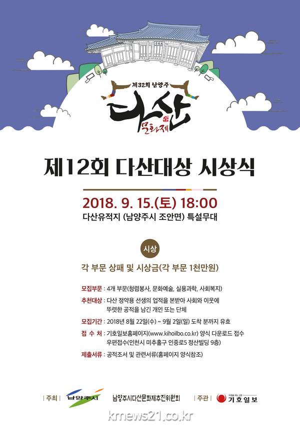 시상식은 오는 9월 15일 오후6시 제32회 남양주다산문화제 행사장에서 개최되며, 상패와 함께 시상금 일천만원이 지급된다.
