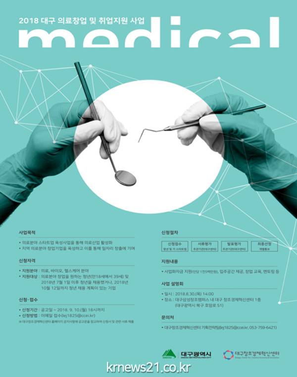 ▲ (사진=대구광역시청)대구시는 5대 주력산업 중 하나인 의료분야의 청년창업 활성화 및 일자리 창출을 위한 ‘대구 의료창업 및 취업지원 사업’을 대구창조경제혁신센터와 함께 본격 추진하고, 9월 10일까지 참여 신청자를 모집한다.