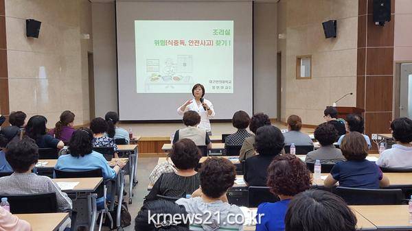이번 연수는 대구한의대학교 정현아 교수의 ‘학교 식중독 예방 및 효율적인 현장 관리’ 주제로 조리실 위험(식중독, 안전사고) 찾기, 식품 중요관리 집중하기, 학교급식 운영에 따른 위생관리 방안 등으로 연수가 진행됐다.