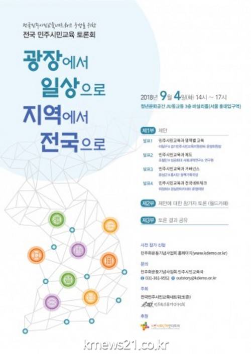 민주화운동기념사업회(이사장 지선)와 전국민주시민교육네트워크 준비위원회가 공동주최하고 시민사회단체연대회의가 후원하는 ‘전국 민주시민교육 토론회’가 9월 4일(화) 오후 2시 서울시 동교동에 위치한 청년문화공간 JU에서 열린다.