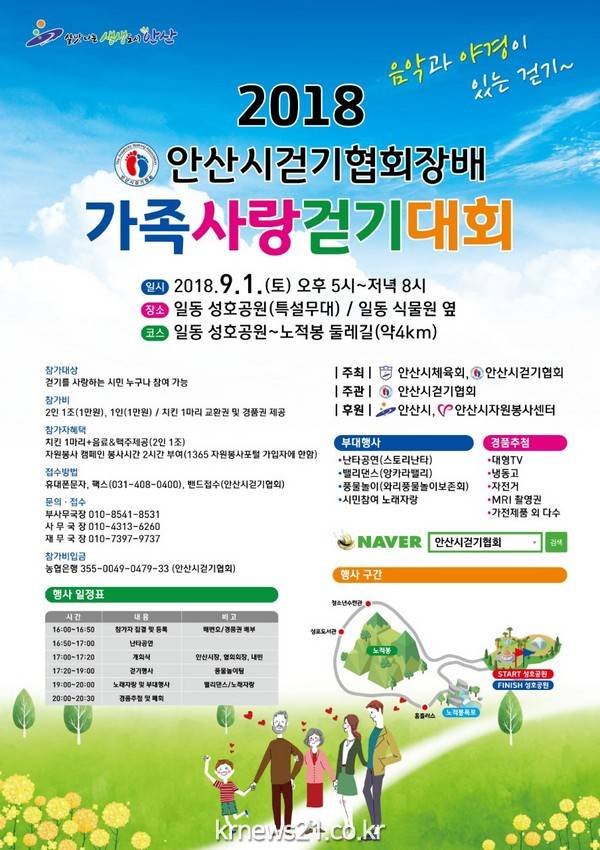 ▲ (사진=안산시청)‘2018 안산시걷기협회장배 가족사랑 걷기대회(이하 걷기대회)’가 오는 9월 1일 오후 5시부터 8시까지 상록구 일동 성호공원(식물원 옆)에서 진행된다.