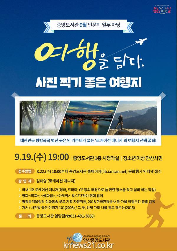 안산시 중앙도서관(관장 최경호)은 로케이션 매니저 ‘김태영’을 초청해 9월 인문학 열두 마당을 진행한다.