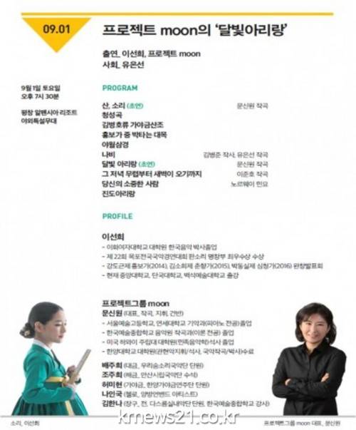 이번 공연은 가을의 문턱을 넘어선 평창 알펜시아에 가을정취 가득한 공연 ‘프로젝트 moon의 달빛아리랑’으로 진행될 예정이다.