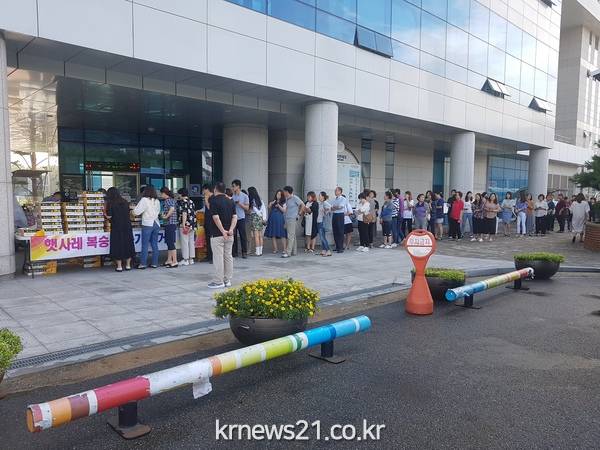 ▲ (사진=이천시청)이천시(시장 엄태준)와 경기동부과수농협(조합장 이종태)은 지난달 31일 햇사레 복숭아 농가 직거래 행사를 이천시청 광장에서 열었다.