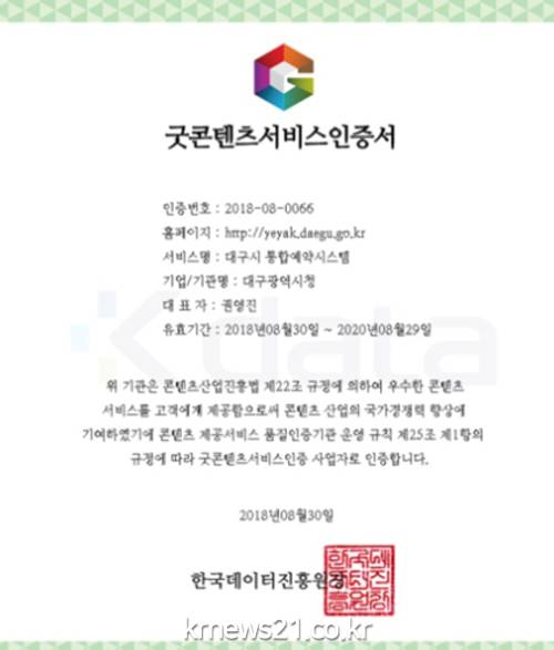 ▲ (사진=대구광역시청)대구시가 올해 1월부터 시민들의 편의를 위해 공공서비스 예약을 통합하여 온라인 단일창구로 운영중인 통합예약시스템(http://yeyak.daegu.go.kr)이 ‘굿콘텐츠서비스인증’을 획득했다.