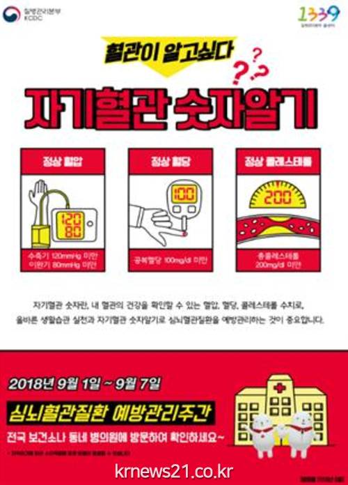 ▲ (사진=질병관리본부)울산시는 심뇌혈관질환 예방관리주간(9월 1일 ~ 7)을 맞이하여 오는 9월 4일 울산KTX역 대합실에서 ‘자기혈관 숫자알기, 레드서클 합동 캠페인’을 실시한다.