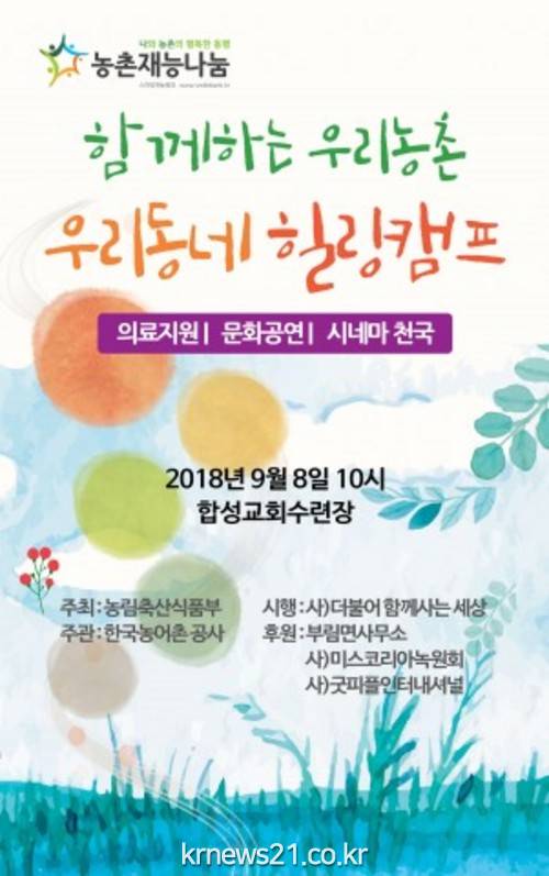 더불어 함께사는 세상(대표 김영숙)이 경상남도 의령군 부림면 권혜리마을 어르신들을 위한 ‘함께하는 우리 농촌 우리 동네 힐링캠프’ 행사가 9월 9일 합성교회 수련장에서 진행한다고 밝혔다.
