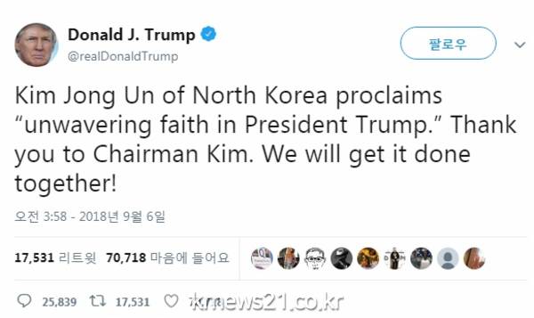 트럼프 대통령은 트위터를 통해 김정은 위원장이 자신에 대해 “흔들림없는 신뢰(unwavering faith)”를 보내왔다면서 “우리는 함께 해낼 것(We will get it done together!)”이라고 적었다.