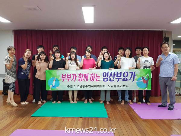 군포시 오금동은 태아와의 첫 만남을 준비하는 예비 부모들의 행복하고 건강한 출산을 돕고자 관내 거주하는 20주 이상 임산부 부부 10쌍을 대상으로 ‘부부가 함께하는 임산부 요가교실’을 운영하고 있다.