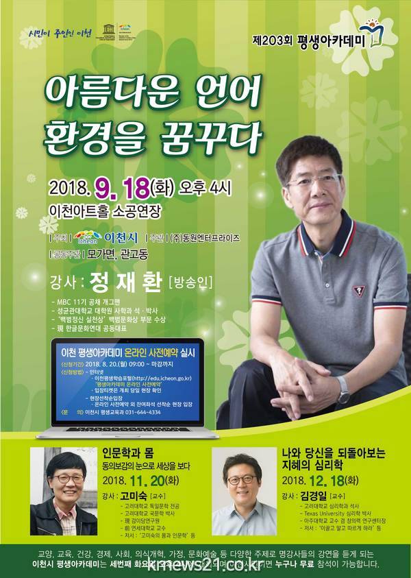 ▲ (사진=이천시청)이천시(시장 엄태준)는 18일 오후 4시 이천아트홀 소공연장에서 방송인이자 한글문화연대 공동대표로 활동하고 있는 정재환 강사를 초청해 ‘아름다운 언어 환경을 꿈꾸다’라는 주제로 제 203회 평생아카데미를 개최한다.