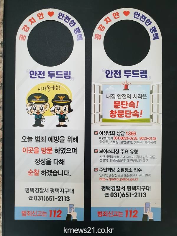 평택경찰서(김태수) 평택지구대에서는 주민이 안심하고 평온한 명절을 보내기위해 추석 전·후 현금다액 취급업소 대상 강·절도 범죄를 예방 하고자 안전 두드림 카드를 제작하여 공동체치안은 물론 체감치안 향상을 위한 특별방범 활동에 주력하고 있다고 밝혔다. 이에 주민이 순찰을 희망한 장소를 순찰했을 경우, 매번 「안전 두드림 카드」를 걸어두어 지역주민들을 안심시키고 있다.