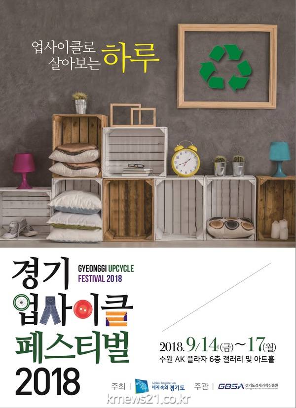 경기도는 도내 업 사이클 문화 활성화를 위하여 ‘경기 업 사이클 페스티벌 2018’을 14일부터 17일까지 4일간 수원 AK 플라자 6층 갤러리 및 아트홀에서 개최한다.