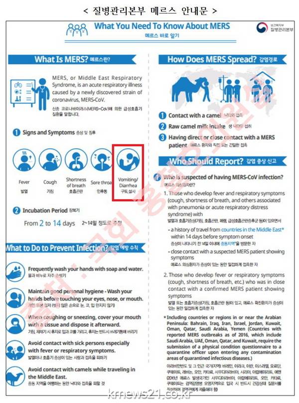 질병관리본부의 메르스 안내문을 보면 메르스의 증상은 설사를 포함하여 발열, 기침, 호흡곤란, 인후통, 구토 등이다.