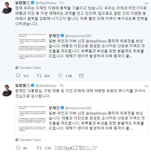 아베 총리는 자신의 트위터에 지난 10일 밤 "문재인 대통령님, 이번 태풍 및 지진 피해에 따뜻한 위로의 메시지를 주셔서 진심으로 감사한다"고 한국어와 일본어로 답했다.