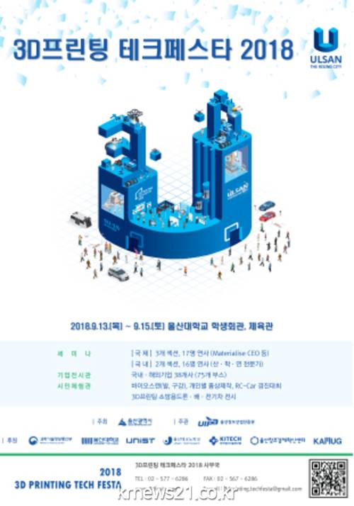 울산시는 9월 13일부터 15일까지 울산대학교에서 ‘4차 산업혁명 제조혁신을 위한 3D프린팅 기술 상용화’를 주제로 ‘3D프린팅 테크페스타 2018’을 개최한다고 밝혔다.