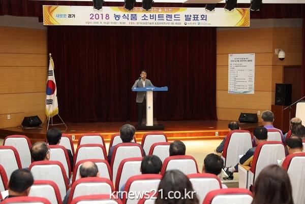 경기도농업기술원과 농촌진흥청은 도내 쌀, 오이, 포도 농가 관계자 100여 명을 대상으로 ‘2018 농식품 소비트렌드 발표회’를 14일 개최했다.