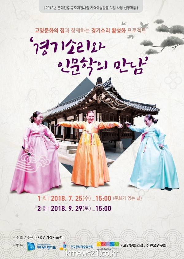 인문학 강연과 시민 토론회를 통해 경기민요와 경기잡가의 발전 및 활성화 방안을 모색해보는 이색 예술 프로젝트 ‘경기소리와 인문학의 만남’이 오는 9월 29일 (토) 오후 3시 경기도 고양시 고양문화의집에서 열린다.