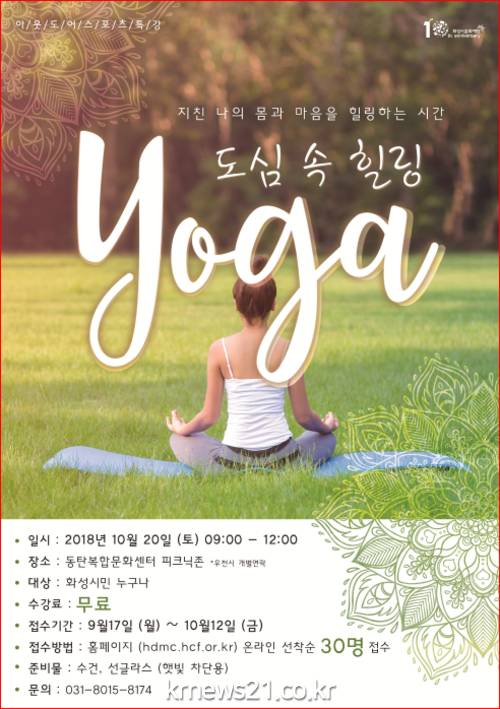 ‘도심 속 힐링요가’는 무료로 진행되며, 9월 17일부터 10월 12일까지 동탄복합문화센터 홈페이지 (hdmc.hcf.or.kr)에서 선착순 30명을 모집하여 진행한다.