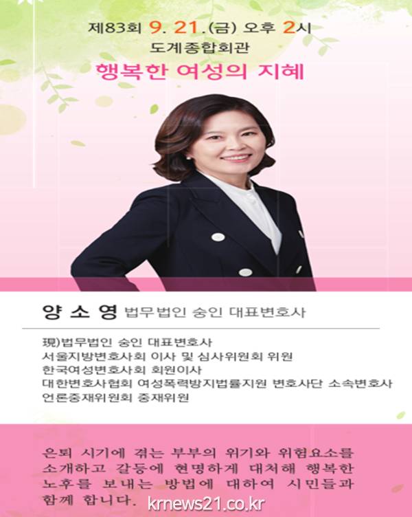 이번 아카데미는 KBS “아침마당”, MBN “속풀이쇼 동치미” 등 각종 방송프로그램에서 왕성하게 활동하고 있는 양소영 변호사를 초청하여 ‘행복한 여성의 지혜’를 주제로 강연이 펼쳐진다.