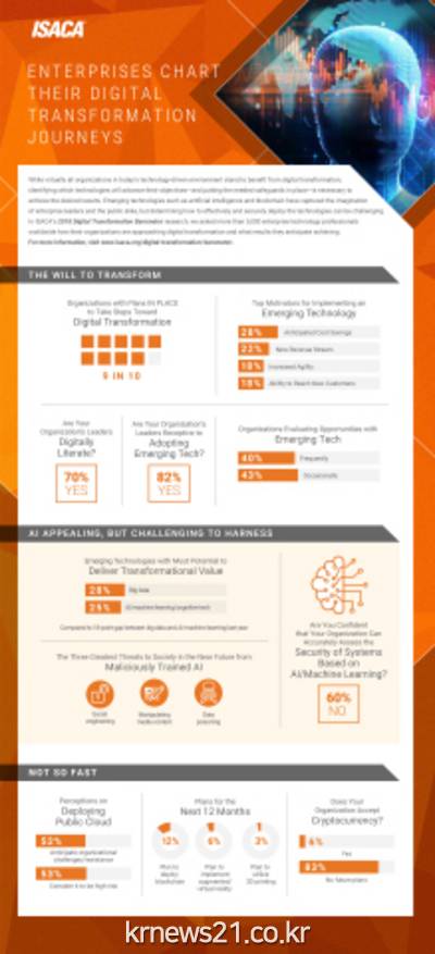 세계정보시스템감사통제협회(ISACA)가 최근 두 번째로 벌인 ‘디지털 트랜스포메이션 바로미터(Digital Transformation Barometer)’ 설문조사 결과 AI와 머신러닝에 기반한 정보시스템을 구축해도 정보보안의 문제가 발생하지 않을 것이라는 입장을 보인 응답자는 40%선에 그쳤다. 디지털 트랜스포메이션 바로미터는 전 세계 기업체의 기술책임자들을 대상으로 매년 실시하는 설문조사로 빅데이터, AI, 공용 클라우드 서비스 등 디지털 혁신을 가속할 첨단 기술이 어떻게 산업현장에 적용되고 어떤 영향을 미치고 있는지를 알 수 있다.
