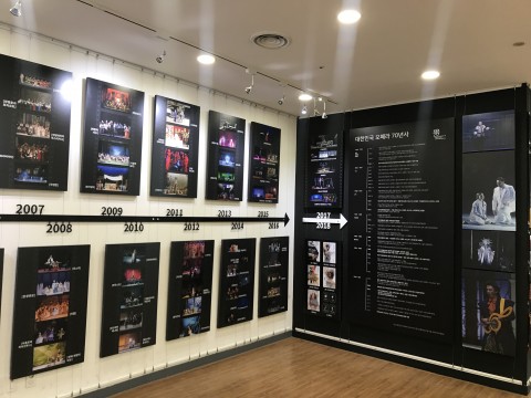 대구오페라하우스 1층 오페라살롱 전시장 입구 양 벽면에는 대구오페라하우스가 걸어 온 ‘해외진출의 역사’가 고스란히 담겨 있다. 기존 2015년 독일 칼스루에국립극장 및 이탈리아 살레르노베르디극장 진출 내용과 함께, 2016년 독일 본국립극장, 2017년 일본 히로시마 아스텔 프라자 및 대만 국립극장 무대에 올랐던 발자취를 한 눈에 확인할 수 있도록 준비하였다.