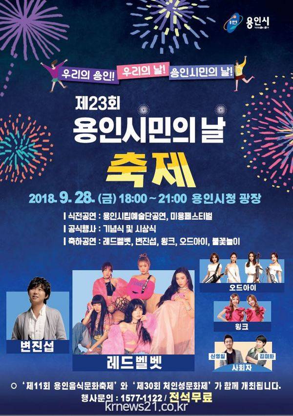 시 관계자는 “시민들에게 문화예술 향유의 기회를 확대하기 위해 마련한 이날 축제의 주인공은 용인시민들”이라며 “시민 여러분의 많은 관심과 참여를 부탁한다.”고 말했다.