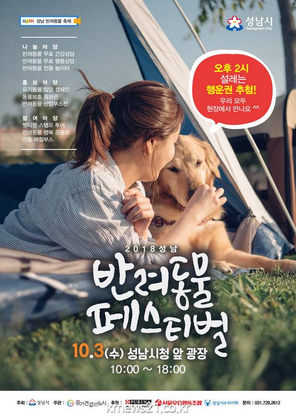 성남시(시장 은수미)는 오는 10월 3일 오전 10시~오후 6시 시청 광장에서 ‘반려동물 페스티벌’을 연다.