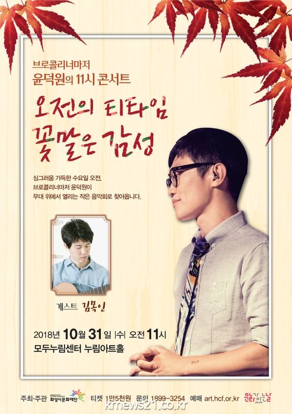 ‘브로콜리너마저’의 윤덕원이 메인 아티스트로 나선 누림 아트홀의 11시 콘서트 <</span>오전의 티타임, 꽃말은 감성>이 오는 10월 31일 수요일 올해의 마지막 무대를 올린다. 수요일 오전에 가볍게 즐길 수 있는 토크 콘서트 형식의 ‘11시 콘서트’는 무대 위에서 아티스트와 관객이 가까이에서 호흡하고 즐길 수 있는 하우스 콘서트이다.