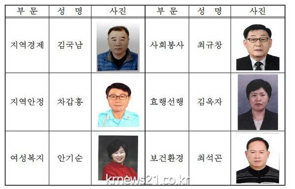 모범시민은 지역경제 부문 김국남(56·남), 지역안정 부문 차갑흥(65·남), 여성복지 부문 안기순(53·여), 사회봉사 부문 최규창(75·남), 효행선행 부문 김옥자(64·여), 보건환경 부문 최석곤(65·남) 씨다.