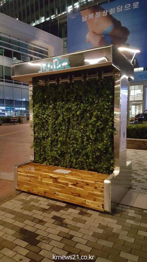 최근 마포구청 광장에 설치된 미세먼지 저감 벤치는 외부 미세먼지를 흡수해 깨끗한 공기로 정화한 후 다시 외부로 내보내는 방식의 벤치형 휴식공간이다.