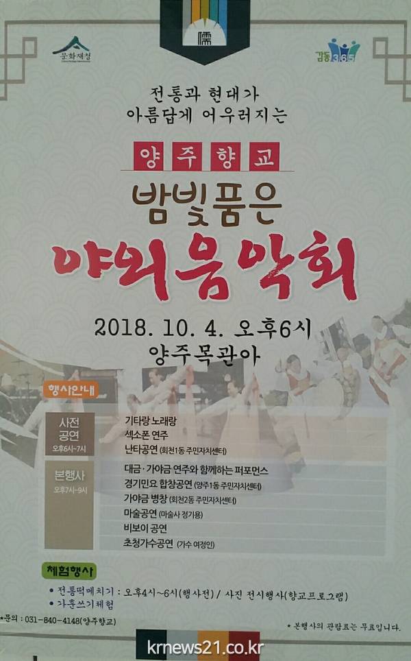 양주향교 관계자는 “전통과 현대가 어우러지는 문화한마당을 통해 깊어가는 가을 역사와 문화예술을 향유하는 즐거운 시간을 보내시기 바란다”고 말했다.