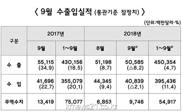 1일 산업통상자원부가 발표한 '2018년 9월 수출입동향'에 따르면 지난달 수출액은 505억8000만달러로 전년 같은 기간 대비 8.2% 감소했다.